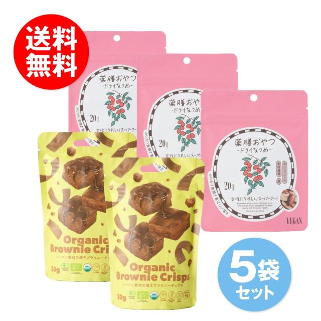 ■人気商品5袋セット■オーガニックブラウニークリスプ 30g×2袋 薬膳おやつドライなつめ20g×3袋 Organic Brownie Crisps ブラウンシュガーファースト 薬膳おやつ ベジキッチン VEGAN ヴィーガン グルテンフリー ギルトフリー