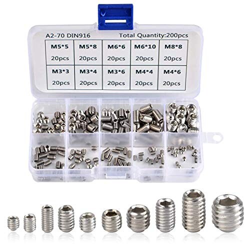 ステンレス製 イモネジ セット(10種類):M3(3mm)、M3(4mm)、M3(6mm)、M4(4mm)、M4(6mm)、M5(5mm)、M5(8mm)、M6(6mm)、M6(10mm)、M8(8mm) 各20個。