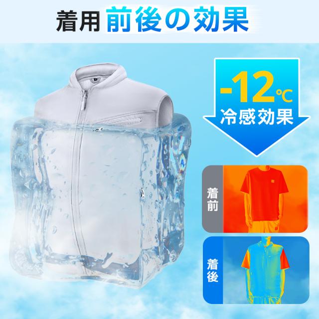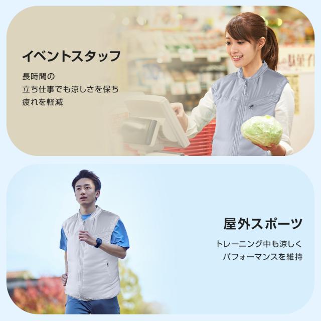 ファン付き 空調ベスト はポリエステル100%の素材を採用され、薄くて軽いです。しかも速乾性と伸縮性も備えて、汗をかいたとき乾きやすいです。表面には撥水加工とUVカット機能を施しているので、ファンと合わせて使用すれば、-12℃の冷感効果を実現し、肌に害をあたえる紫外線を有効にカットし、肌を守ります。一般の衣類と同じように洗濯することが可能ですが、洗濯する時、ファンやバッテリーなどを取り外しておく必要があります。
