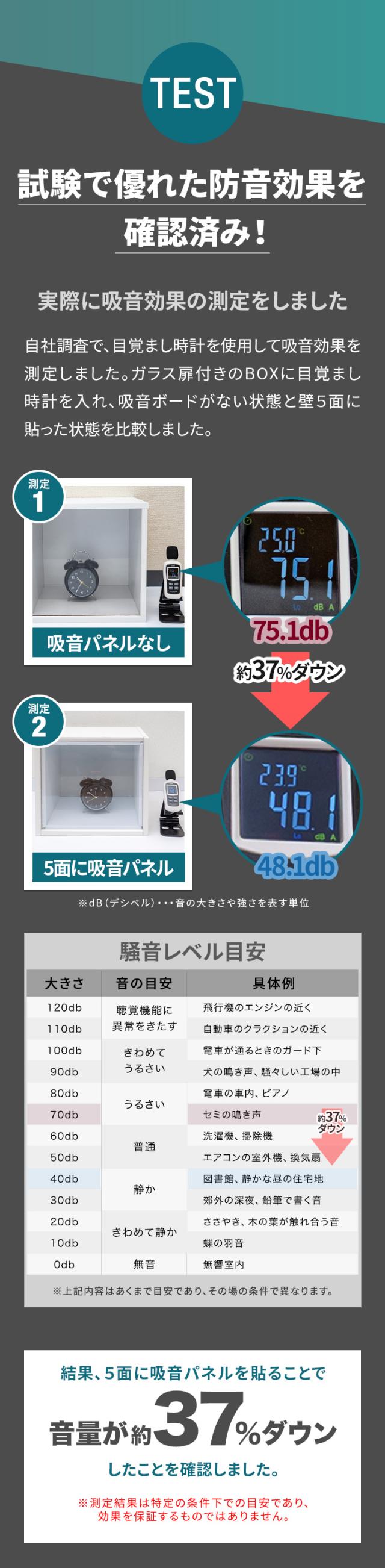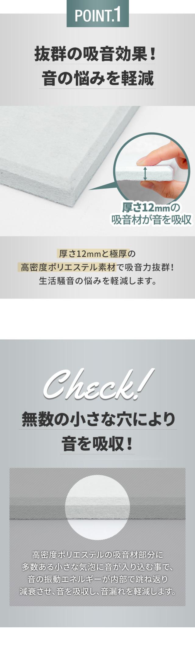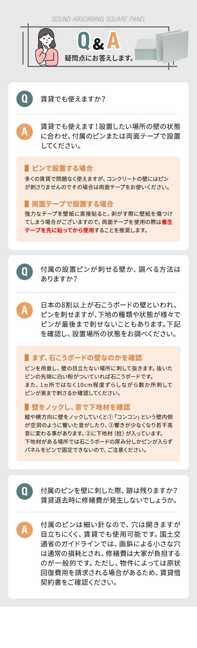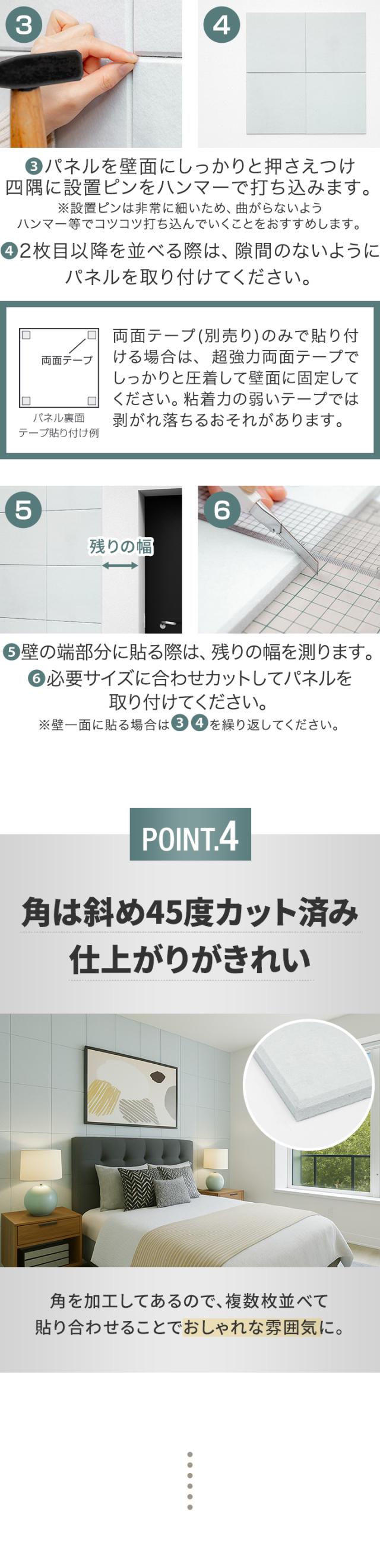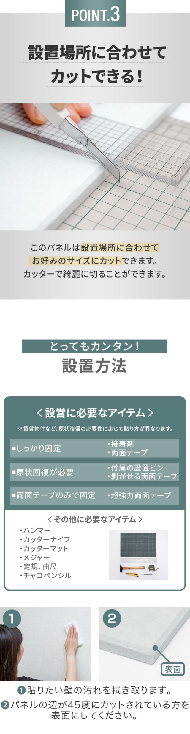| 特記事項: ・本製品は屋内専用です。屋外で使用しないでください。破損の原因となります。 ・本製品は不燃材料ではありません。火のそばに近づけて設置しないでください。火災の原因となります。 ・本製品は防水仕様ではありません。浴室、水回りでは使用しないでください。カビの発生を招くおそれがあります。 ・パネルを保管する際は、必ず平置きにしてください。 立てた状態で置くことで生じる反りや曲がりがパネルの浮きの要因となります。 ・お客様ご自身による施工や使用によって発生した落下、変形、壁の破損、ケガ等のいかなる損害に関して一切の責任を負いかねますのでご了承ください。 ・においを感じる場合はにおいが収まるまで室内をよく換気してください。 ・設置ピンは幼児の手の届かない場所に保管してください。 |
