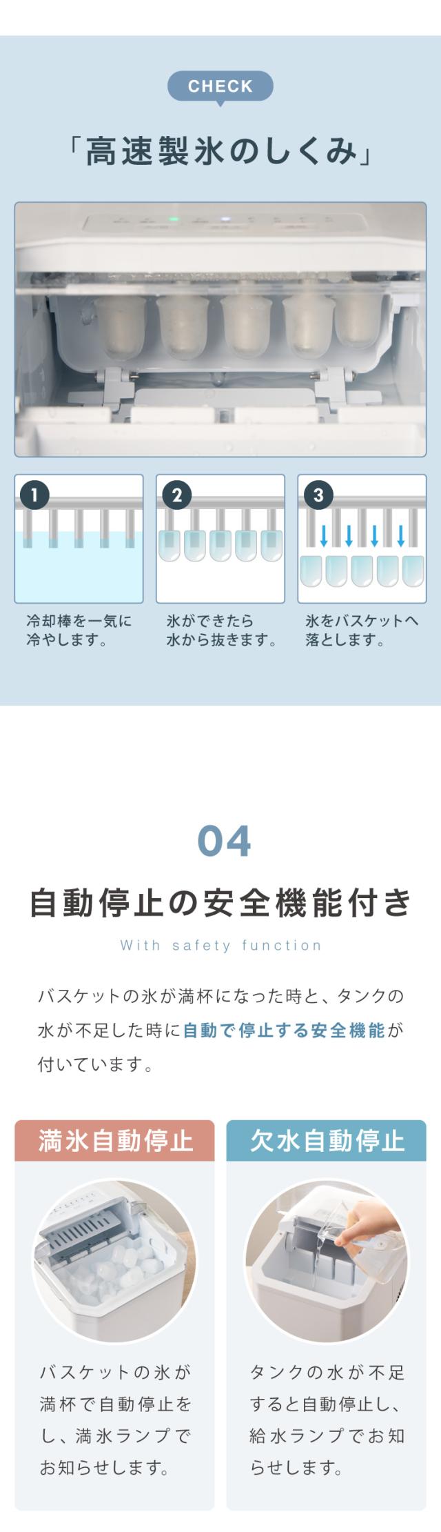 氷が満杯になると自動で停止し、水が不足すると自動で停止する安全機能付き。