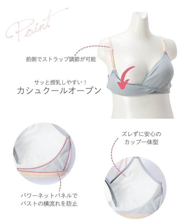 よく伸びるリブ素材で着け心地の良いマタニティ・授乳ブラです。 ■design ・細めの2本ストラップ&ホックが無いバックですっきりしたデザイン。 ・背中開きアウターやシアートップスともコーディネートしやすいです。 ■point ・授乳はカシュクールオープン設計で、さっと片手でカップをずらすだけで授乳ができます。 ・サイドのパワーネットパネルがバストの横流れを防止 ・カップは本体に縫い付けられているので、ズレたりする心配がありません。 ・肩紐のアジャスターが前側に付いているので、サイズの変化に合わせて簡単に調節ができます。 ■fabric ・伸びの良いストレッチリブ素材を使用。アンダー部分も締め付けずラクな着心地です。 ・カップ裏は肌にやさしいコットン素材