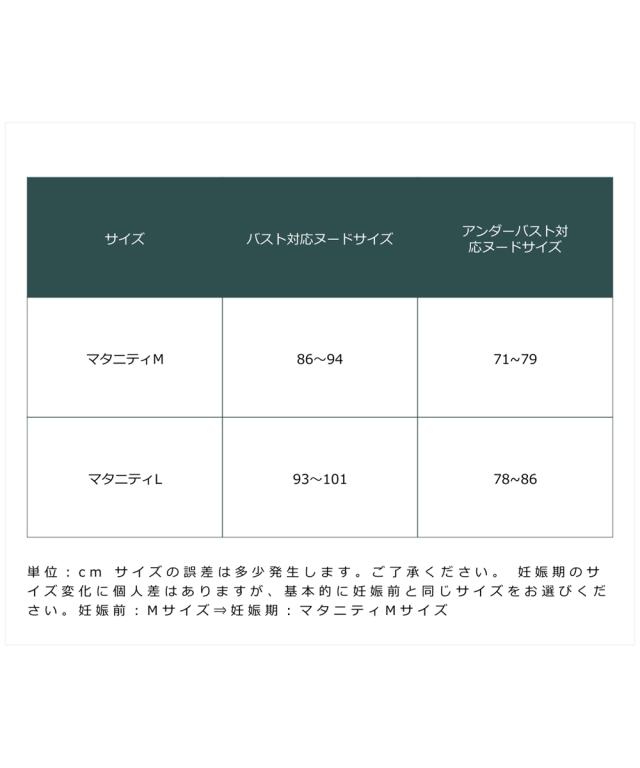 品質:[身生地]綿95%・ポリウレタン5%(カットソー)[カップ裏]綿100%(カットソー) 伸縮性:あり 生地の厚み:普通 調節:可能(肩紐ゴムアジャスターつき) カップ:あり(取り外し不可) 原産国:中国製 備考:洗濯機OK(ネット使用) 単位:cm ※サイズの誤差は多少発生します。ご了承ください。 ※妊娠期のサイズ変化に個人差はありますが、基本的に妊娠前と同じサイズをお選びください。 妊娠前:Mサイズ⇒妊娠期:マタニティMサイズ