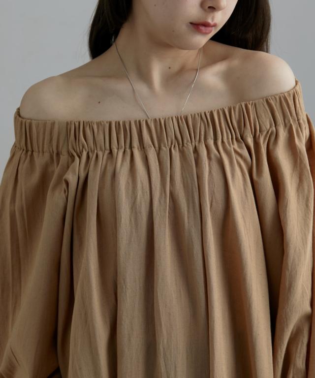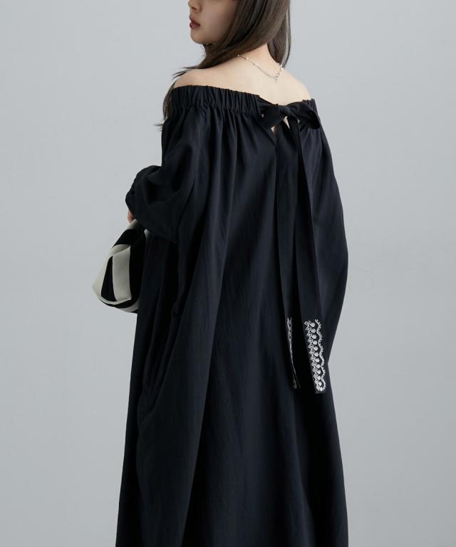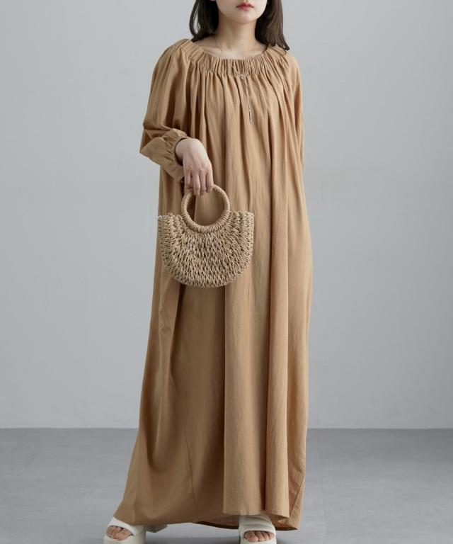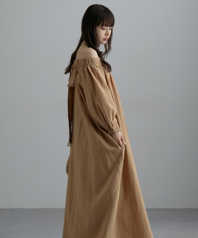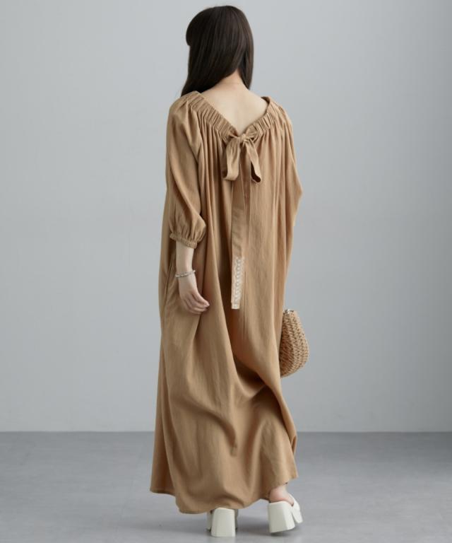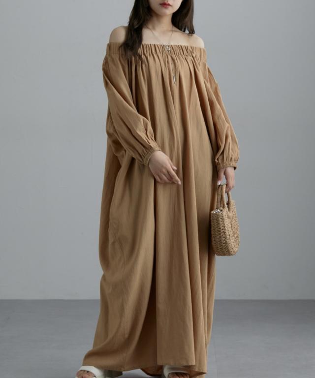 ■デザイン ゆったりしたサイズ感とたっぷりのギャザーがかわいいワンピース。衿部分はゴム入りでオフショルデザインとの2WAYで着用できるのもおすすめポイント。後リボンデザインで着映えするアイテムです。 ■素材 レーヨンに綿・麻を混紡した夏らしい素材を使用しています。落ち感があり広がりにくい素材です。 ■おすすめのスタイリング 一枚でさらっと着用するのはもちろん、デニムシャツをはおったりショート丈のニットカーデをはおるのも今年らしくておすすめです!