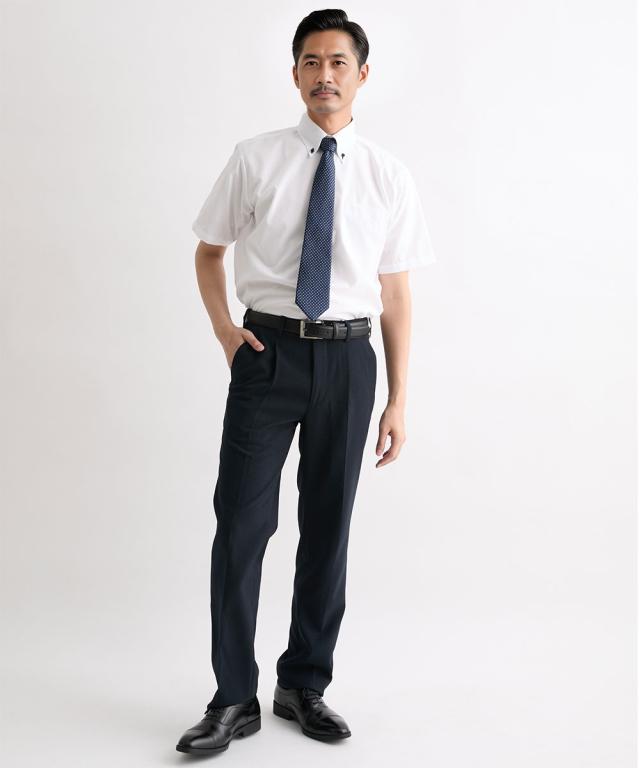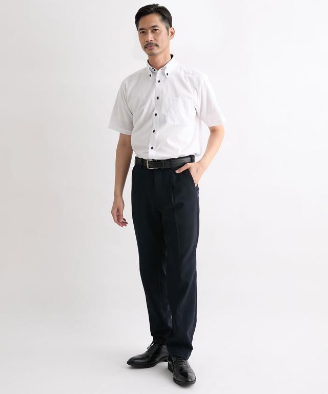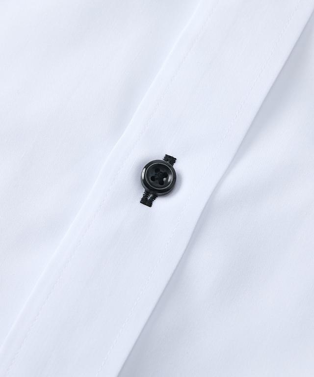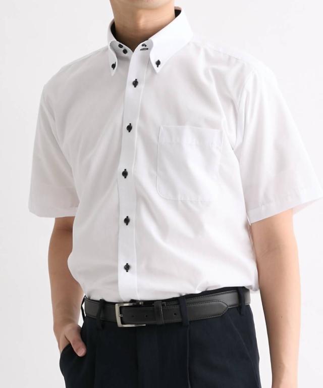 衿高ワイシャツがお好みの方にオススメなモノトーン配色のドゥエボタンダウンワイシャツの半袖です。 台衿裏を濃色の生地で切り替えているので、デザインポイントになりつつ汚れが目立ちにくいです。 形態安定加工により洗濯後のアイロン掛けが楽ちんです! 大きいサイズも展開しております。 ■デザイン 白の無地生地をベースにボタン・ボタン付け糸・ボタンホールを黒で統一しているクールなデザインです。 衿は台衿にボタンが2つ付いているドゥエ(2個の)ボットーニ(釦)デザインで、衿高で艶っぽい印象を与えます。 ベーシックなワイシャツでは物足りない、という方にオススメです! ■素材 綿混の平織素材を使用しております。 形態安定加工により洗濯後しわになりにくくアイロン掛けが楽ちんです。 着る方にも取り扱う方にも嬉しいワイシャツです! ■おすすめのおしゃれスタイリング ベーシックなホワイトですので、黒、ネイビー、グレー等あらゆるパンツとよくマッチします。 ●スタッフ着用コメント 身長:177cm 普段のサイズ:L 着用サイズ:L コメント:いつものサイズで程よいゆったり感でした。タイトめのフィッティングがお好みの方はワンサイズ下のサイズがおすすめです。