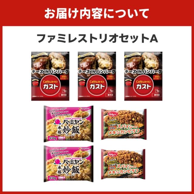 【商品内容】 ガスト チーズINハンバーグ(155gソース入り)×3 バーミヤン 本格炒飯(430g)×2 ジョナサン スパイシーメキシカンピラフ(230g)×2