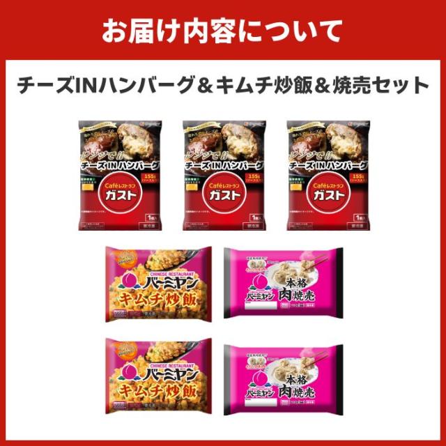 【商品内容】 ガスト チーズINハンバーグ(155gソース入り)×3 バーミヤン キムチ炒飯(270g)×2 バーミヤン 本格肉焼売(6個入り)×2
