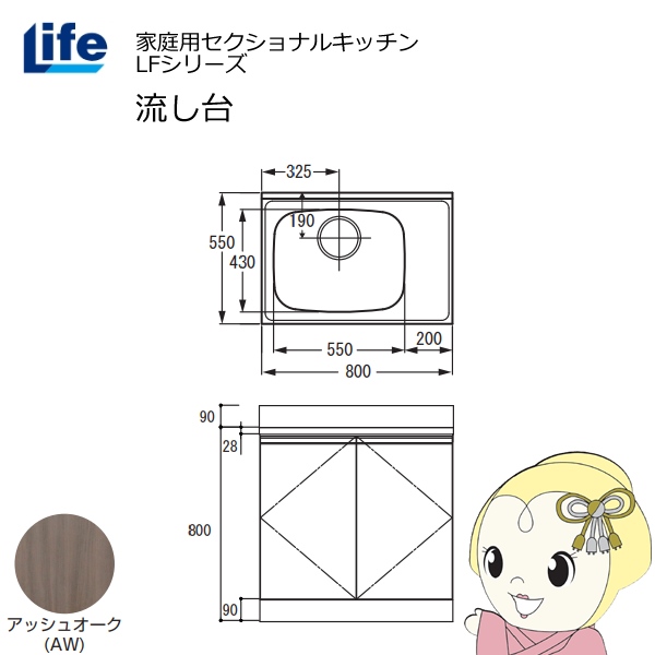 【近畿限定販売】家庭用セクショナルキッチン LFシリーズ ライフ 流し台 左水槽 奥行550mm 化粧仕上げ アッシュオーク LFNF-80-AW-L