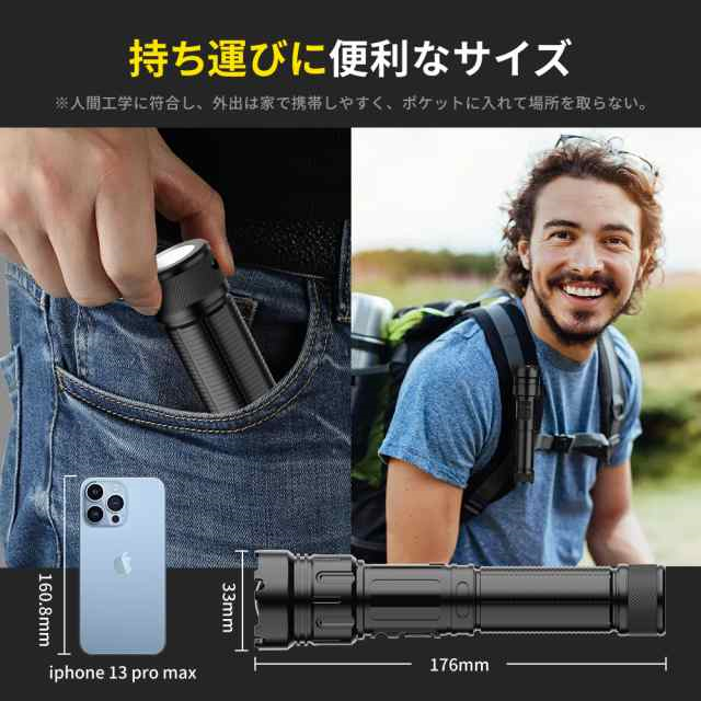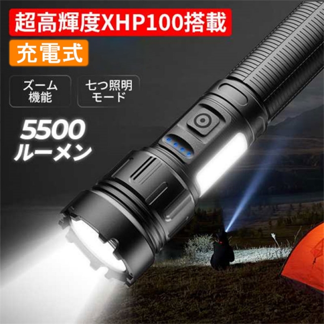 懐中電灯 高輝度 Type-C充電式 5500mAh 大容量 COB作業灯付き ledライト 防水 ハンディライト 白&赤色灯 7モード 残量表示機能 小型 明るい XHP100 自転車 登山 夜釣り 夜間訓練 作業用 停電 防災 地震