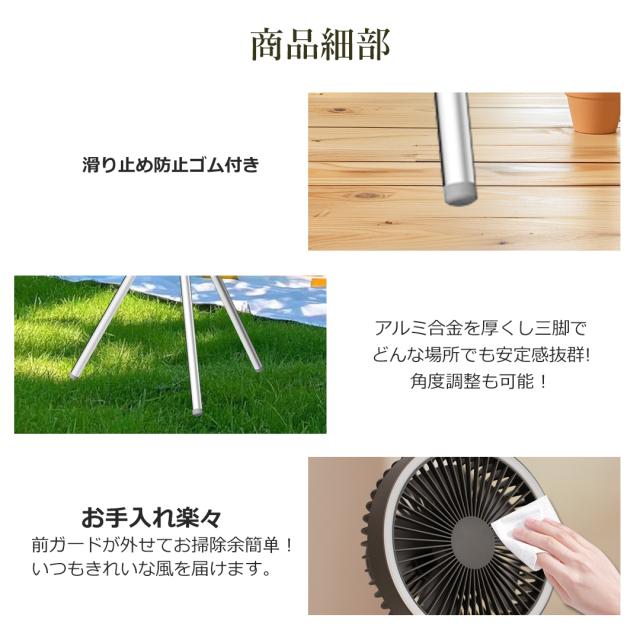 - 三脚が取り付け・取り外し可能なため、設置方法が柔軟になります。設置の際とアウトドア活動の際の利便性が大幅に向上します。お手入れも簡単で、前ガードが簡単に外せるので、内部の掃除がしやすく、いつもきれいな風を提供します。