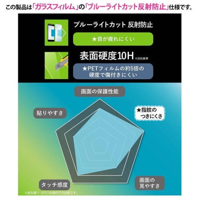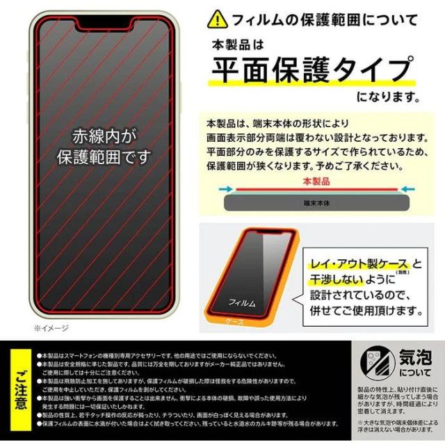 目の疲れを軽減/反射防止タイプ。レイ・アウト製ケース(別売)と一緒に使用しても干渉しない設計。通常のPETフィルムの約3倍以上の硬度で傷付きにくい。汚れをはじくコーティングで清潔な状態を保つ。ブルーライトを約40%軽減し、目の疲れを軽減。※iPhone 16 にはご利用いただけません。ご使用のスマートフォンの機種をお確かめの上、ご購入いただけますようお願いいたします。