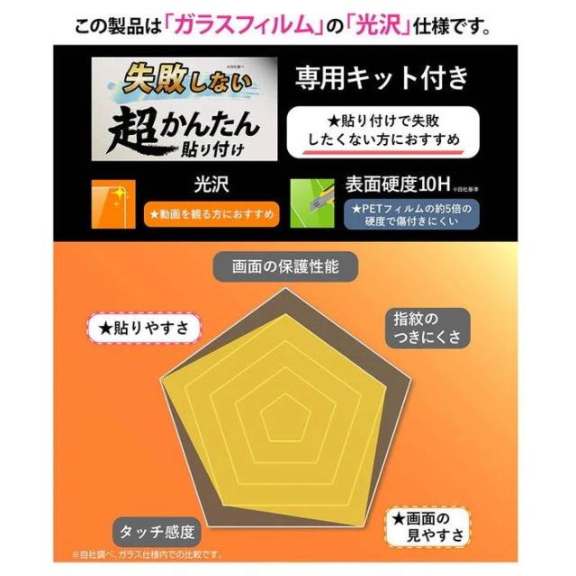 誰でも簡単に貼り付けができる貼り付けキット付きで失敗しない。PETフィルムの約5倍の硬度で傷付きにくい。美しい光沢仕様で、高画質な写真や動画が綺麗に見える。防汚コーティングで指紋防止効果。レイ・アウト製ケース(別売)と一緒に使用しても干渉しない設計。 ※iPhone 16 にはご利用いただけません。ご使用のスマートフォンの機種をお確かめの上、ご購入いただけますようお願いいたします。