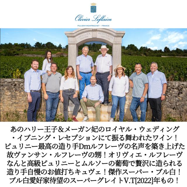 あのハリー王子&メーガン妃のロイヤル・ウェディング ・イブニング・レセプションにて振る舞われたワイン! ピュリニー最高の造り手Dmルフレーヴの名声を築き上げた 故ヴァンサン・ルフレーヴの甥!オリヴィエ・ルフレーヴ なんと高級ピュリニーとムルソーの葡萄で贅沢に造られる 造り手自慢のお値打ちキュヴェ!傑作スーパー・ブル白! ブル白愛好家待望のスーパーグレイトV.T[2022]年もの!