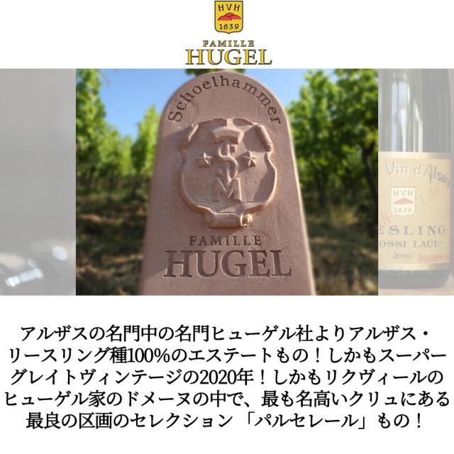 アルザスの名門中の名門ヒューゲル社よりアルザス・リースリング種100%のエステートもの!しかもスーパーグレイトヴィンテージの2020年!しかもリクヴィールのヒューゲル家のドメーヌの中で、最も名高いクリュにある最良の区画のセレクション 「パルセレール」もの!