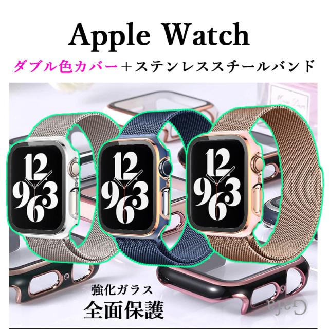 アップルウォッチカバーバンドセット Apple watchカバーバンド ステンレススチールバンド マグネットバンド ダブル色強化ガラスカバー 全面保護 Apple Watch 40mm 41mm 42mm 44mm 45mm 46mm 49mm