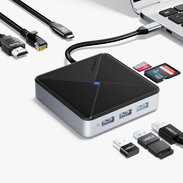 【8-in-1四角い形 USB Cハブ】GiGimundo USB Type-Cハブは3つのUSB3.0 Aポート(5Gbps)、100W PD充電ポート、SD/TF カードリーダ、4K@60HZ HDMI出力ポート、1000Mbps イーサネットポートが搭載されており、大幅に作業効率を改善することが可能です。製品の上下に放熱穴があり、熱対流を形成し、放熱しやすく、安定しています。