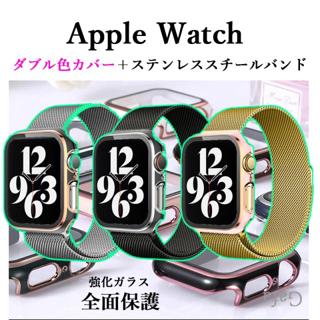 アップルウォッチカバーバンドセット Apple watchカバーバンド ステンレススチールバンド マグネットバンド ダブル色強化ガラスカバー 全面保護 Apple Watch 40mm 41mm 42mm 44mm 45mm 46mm 49mm