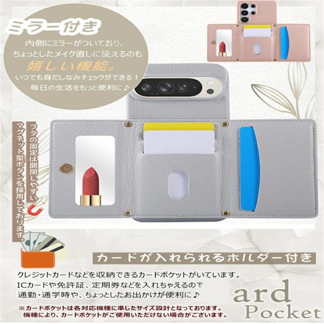 ○ ミラーで身だしなみチェックができたりと上品なデザインの中にも高機能さを併せ持つ背面手帳型ケース。