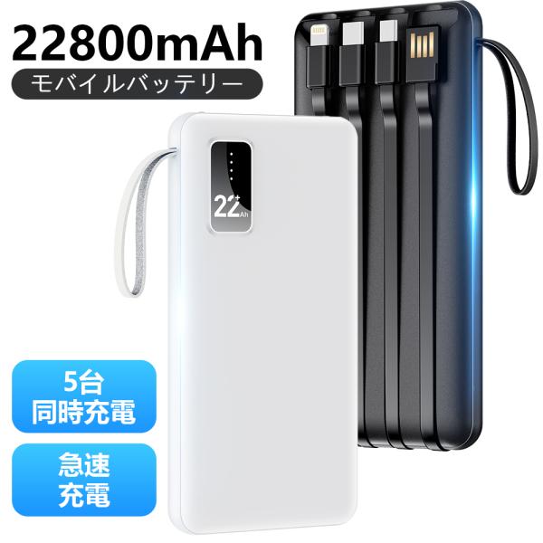 モバイルバッテリー 大容量 小型 軽量 22800mAh 薄型 5台同時充電 急速充電 5v/2.4a スマホ充電器 残量表示 4本ケーブル内蔵 iPhone Android