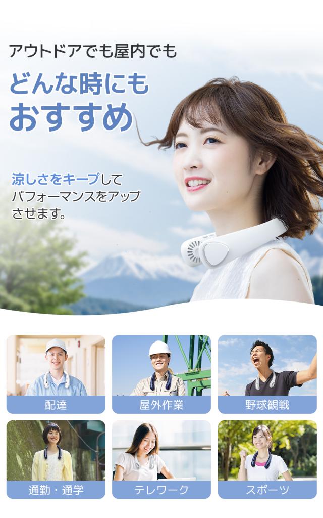 首掛けファンは首からかけて清涼感を楽しめながら両手が自由に使えるので、室内はもちろん、アウトドアで携帯扇風機としても大活躍!