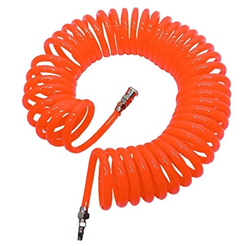 エアーコンプレッサー用スパイラルエアーホースです。 内径8mmで高流量に対応、有効長10mで広い作業範囲に対応いたします。折れ曲がりに強いPU製エアーホースです。 ワンタッチカプラー装着されておりますので、到着後にすぐにご使用いただけます。