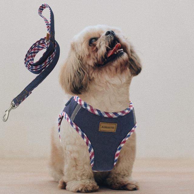 Aiminto デニム犬用ハーネス&リードセット、通気性の高いメッシュ素材、軽量、ハーネス胸元に反射材付き - 小型犬用 (ハーネスとリード