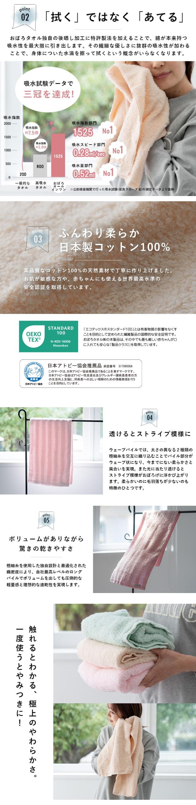 おぼろタオル独自の後晒し加工に特許製法を加えることで綿が本来持つ吸水性を最大限に引き出します。