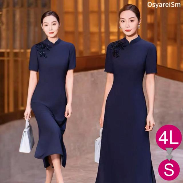 フォーマルドレス 50代 60代 結婚式 ミセス 母親 ドレス マザーズドレス 親族 ネイビー ワンピース 袖あり 40代 マザードレス ロング ロングドレス 演奏会フォーマルワンピース シニア 体型カバー パーティードレス 大きいサイズ フォーマル 顔合わせ 服装 お呼ばれ ミモレ丈