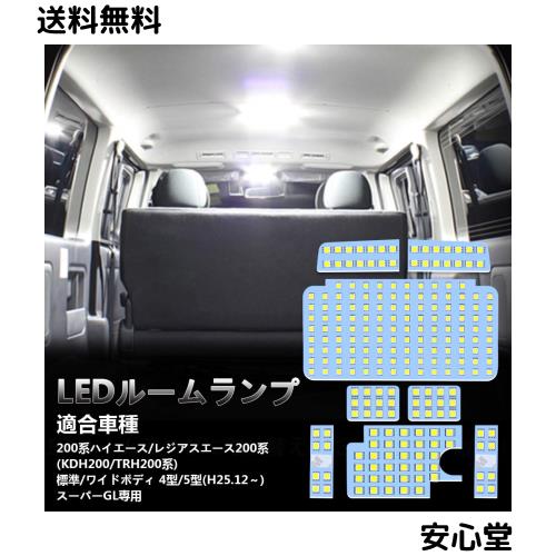 製品情報:LEDルームランプセット 【適合車種】:トヨタ 200系ハイエース/レジアスエース200系(KDH200/TRH200系) 標準/ワイドボディ 4型/5型/6型(H25.12〜) スーパーGL専用 【発光カラー】:ホワイト 6000K 【セット内容】:フロントランプ×2、センターランプ×1、 バックドア用ランプ×1、足元ランプ×2、ライセンスランプ×2、全8点。
