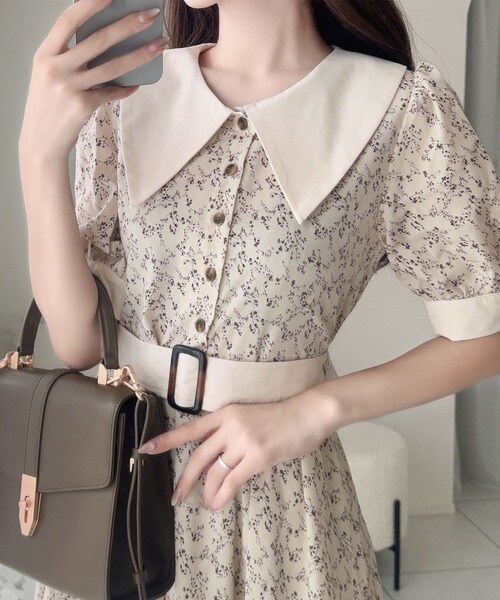 【mily bilet】春 夏 のマストハブ!小花柄ベルト付きビッグカラーワンピース(ロング丈)