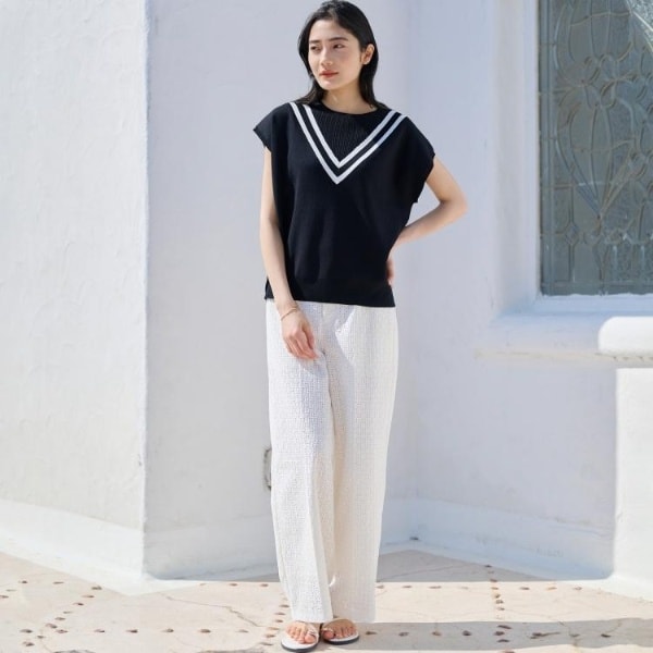 ネックからラインにかけて施した透かし編みが、軽やかで抜け感のある印象を演出します。