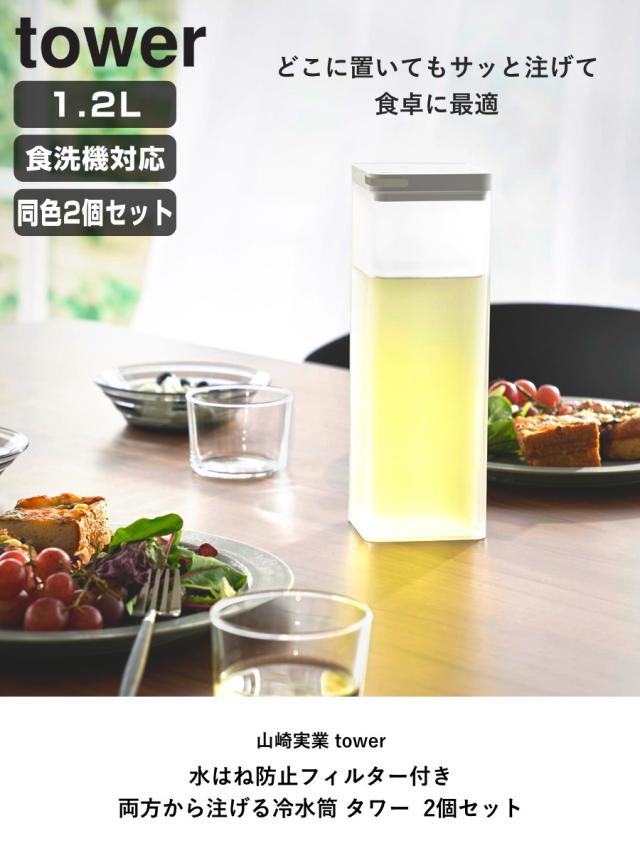 山崎実業 tower 水はね防止フィルター付き両方から注げる冷水筒 タワー 2個セット ( 4903208102377 タワーシリーズ 両方から注げる冷水筒 水はね防止フィルター付き 冷水筒 ピッチャー 1.2L 食洗機対応 2個 )