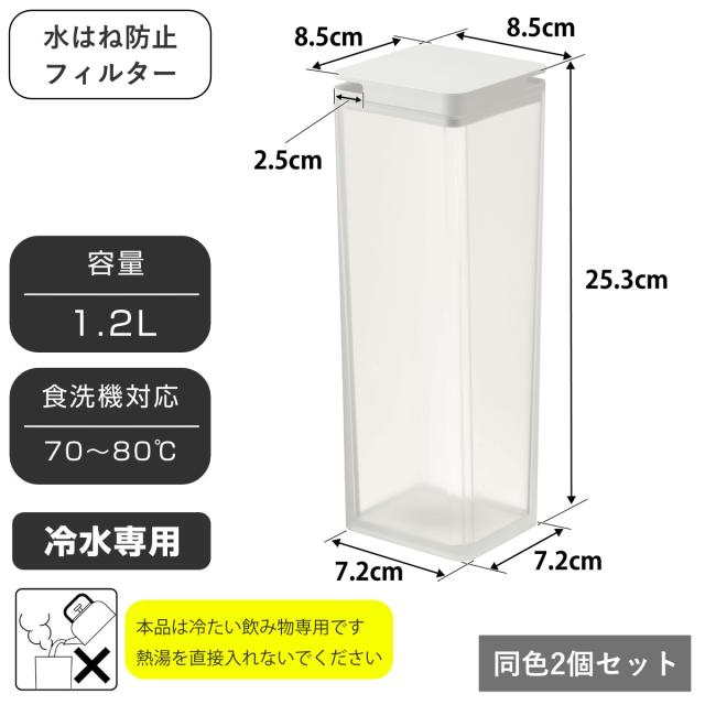 容量1.2Lのスリムな冷水筒 同色2個セットです。1人暮らしの方やコンパクトに収納したい方におすすめです。ゆっくりと注ぎ口が下になるように傾けるだけで簡単に注ぐことができます。