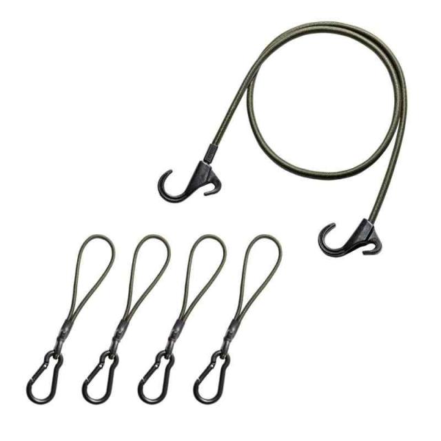 キャンプサイトでテントのロープやタープポール、クルマのルーフキャリア、木の枝などに橋渡しするように引っかけて、クッカー、マグカップ、なべ掴み、エプロンなど色々なアウトドアギアを吊り下げられる。