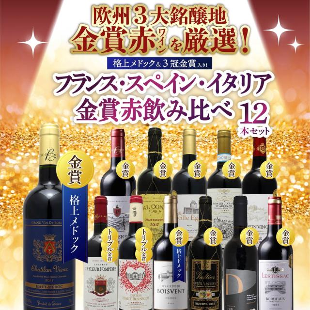 【赤】欧州金賞赤ワイン 格上メドック&3冠金賞入り!ヨーロッパ銘醸地金賞赤ワインセット フルボディ ミディアムボディ フランス スペイン イタリア 赤ワイン 12本 飲み比べ セット WineDish クリスマス_dk
