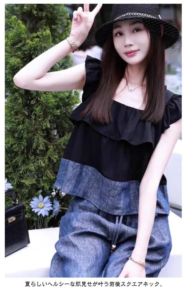 秋 デニム バイカラー 夏 トップス キャミソール タンクトップ 可愛い パンツ カジュアル レディース 春 配色 きれいめ ロングパンツ ワイドパンツ エレガント セットアップ ブラック 大人 スーツ ノースリーブ スクエアネック フリル 黒 ブルー 20代 30代 40代