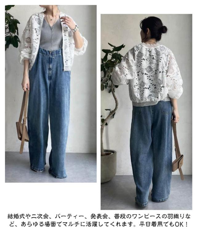 | さらっと羽織る総レースジャケット ワンピースやドレスと合わせやすいレースデザインのボレロ。フラワーモチーフのレースは、大人可愛いスタイルを叶えます。 気になる二の腕もさりげなくカバー。レースの透け感がきれいめシルエットを演出します。 総レースのフェミニンでエレガントな大人可愛いパーティーアウターです。 結婚式や二次会、パーティー、発表会、普段のワンピースの羽織りなど、あらゆる場面でマルチに活躍してくれます。平日着用でもOK! | |