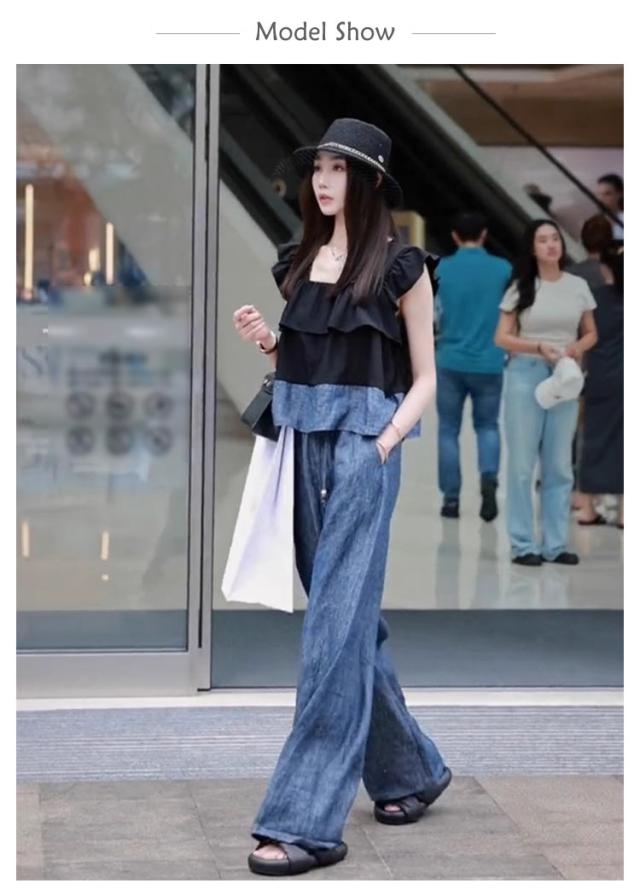 配色 スーツ レディース パンツ 夏 スクエアネック キャミソール エレガント デニム トップス 春 カジュアル ロングパンツ バイカラー 大人 ワイドパンツ セットアップ きれいめ セットアップ 秋 可愛い ノースリーブ フリル ブラック 黒 ブルー 20代 30代 40代