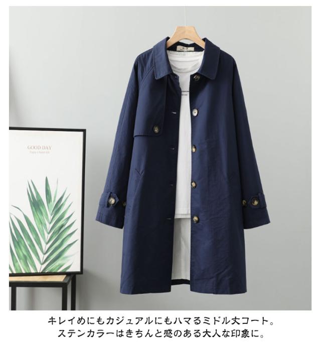 | 軽やかなミドル丈で着回し力の高いトレンチコート。 キレイめにもカジュアルにもハマるミドル丈コート。 ステンカラーはきちんと感のある大人な印象に。 シンプルなデザインはシーンを選ばず、 休日のお出掛けにはもちろん、 通勤にもオススメです。 素材も薄すぎず、上品で上質感があり、 大人の女性にぴったりのON/OFF兼用アウターです。 | |