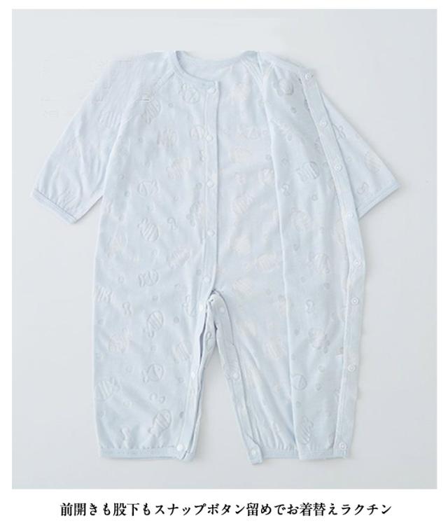 | 夏にぴったりなデザインが可愛いカバーオールです 通気性にすぐれた綿素材のメッシュ素材 汗かきなベビーもサラサラ快適な着心地 前開きも股下もスナップボタン留めでお着替えラクチン | |
