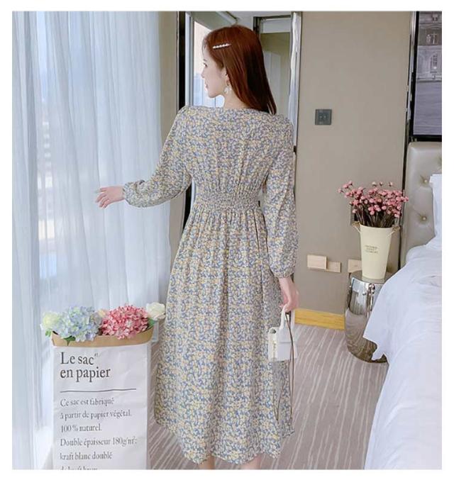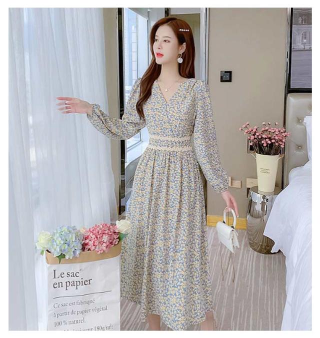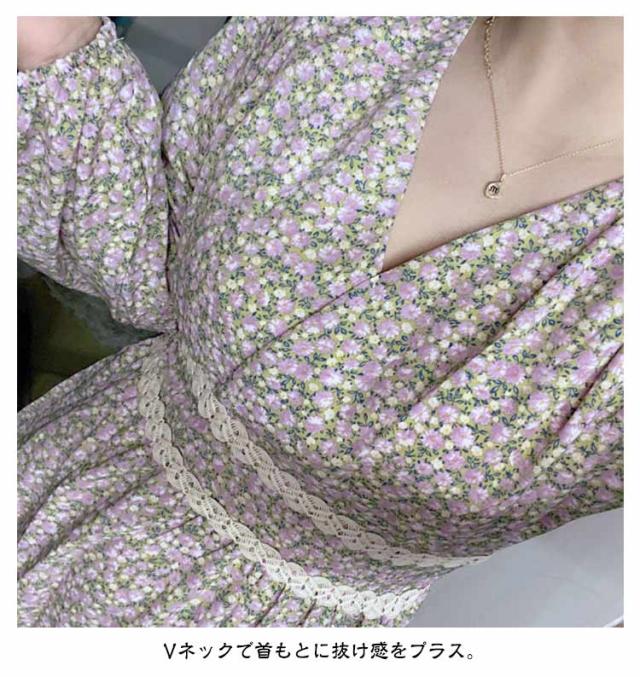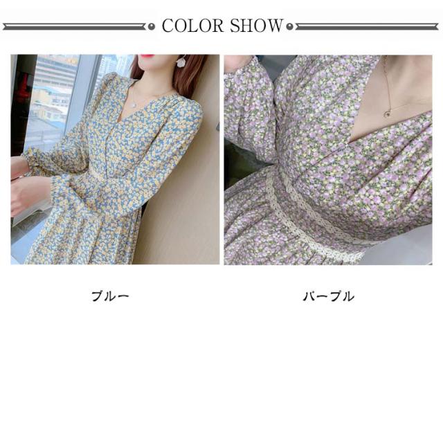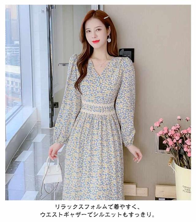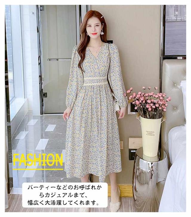 ワンピース 小花柄 Vネック 春 秋 ロングワンピース 夏 着?せ ハイウエスト レディース カジュアル レイヤード 長袖 ドレス Aラインワンピース Aライン ワンピース 体型カバー デートフェミニン 20代 30代 40代