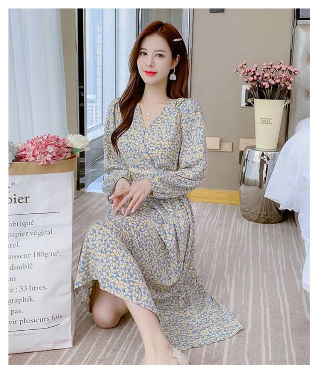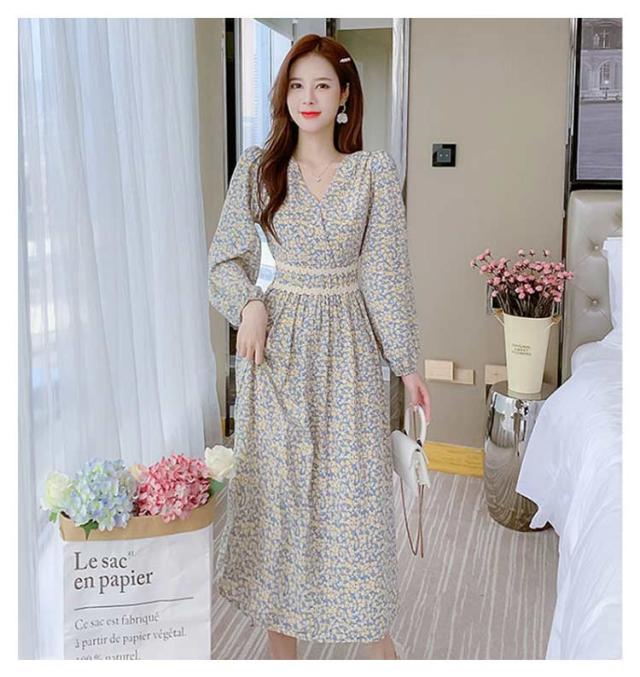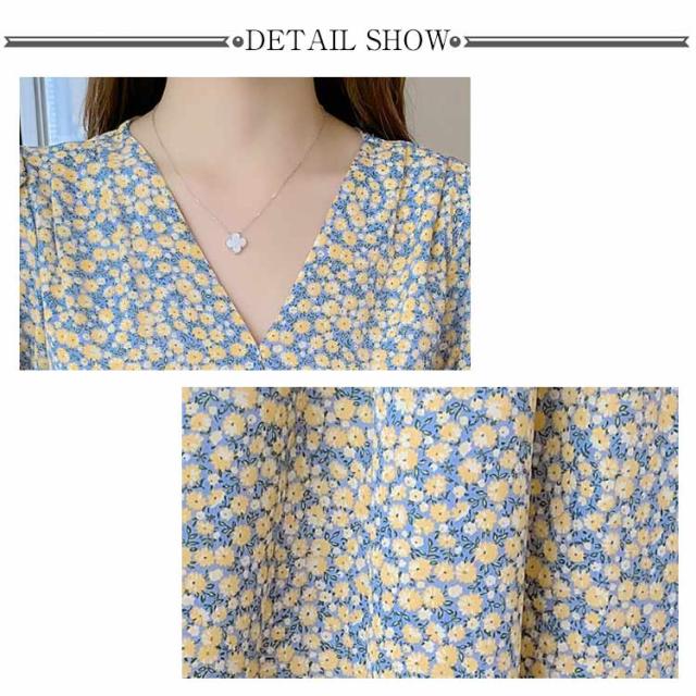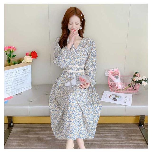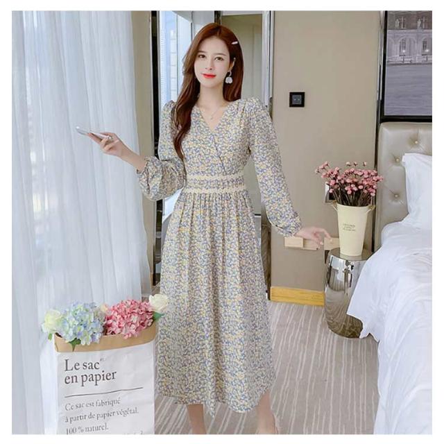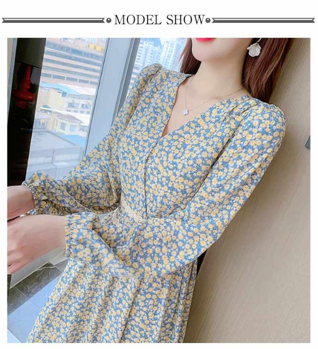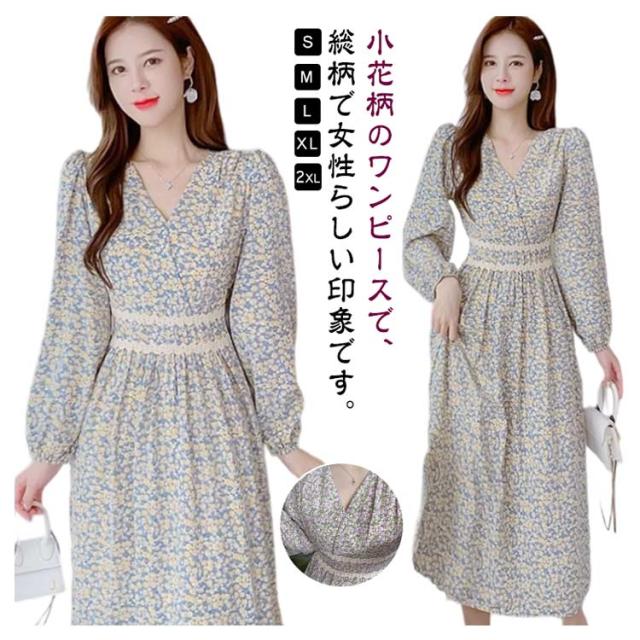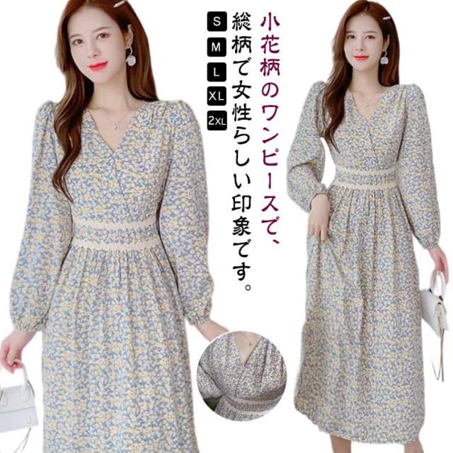春 秋 ドレス 20代 夏 カジュアル 小花柄 着?せ Vネック きれいめ ハイウエスト ロングワンピース 長袖 ワンピース Aラインワンピース Aライン レイヤード 体型カバー デートフェミニン ワンピース 30代 40代