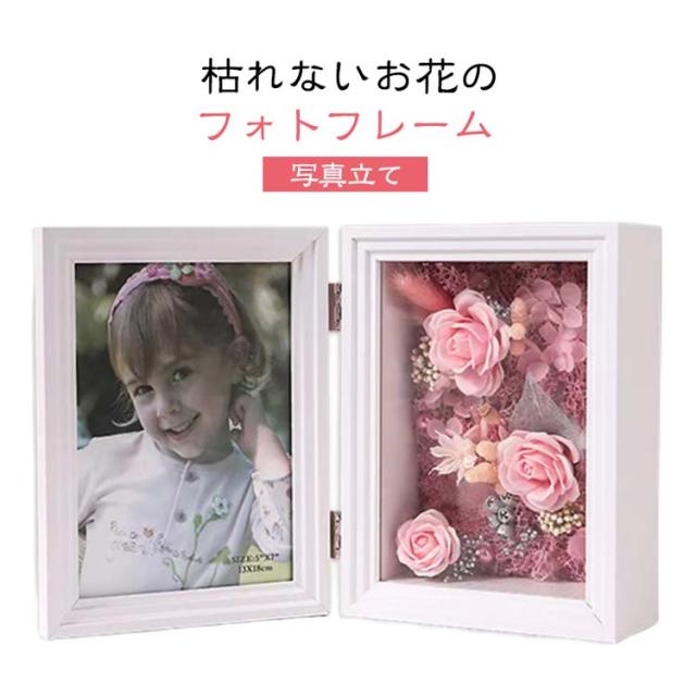| 枯れないお花のフォトフレーム。 大切な思い出を華やかにおしゃれに飾れるお花のフォトフレーム、ソープフラワーを使っているので、水やりなど必要がなく、美しさを保ったまま長く飾っていただけます。 2L判サイズの写真を入れて、世界に一つだけのギフトに早変わり! 記念写真や家族写真にお花を添えて、感謝やお祝いの気持ちを込めて世界に一つの贈りものをしませんか! 温もりのある木製フレーム、ナチュラルで高級感のある雰囲気を演出してくれる枯れないフラワー写真立てです。 フレームとガラスでお花が覆われているので、ホコリがお花に直接付かないから、いつも綺麗なまま飾れるのが嬉しいポイントです。 誕生日や結婚祝い、母の日のギフト、敬老の日、入学祝い、就職祝い、退職祝い、卒業式など様々なシチュエーションにピッタリです。 | |