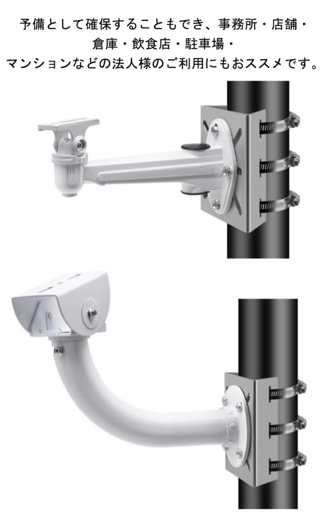 | 防犯カメラなど様々な器具を多用な場面で活用できる取付け用のブラケットセットです。 付属のステンレスバンドで円柱・角柱などの支柱に防犯カメラなど取り付けたい器具をしっかり固定する設計となっております。 ステンレス材質なので、防水・防錆設計で、耐久性に優れ、屋外の過酷な環境でも長期間使用可能です。 外壁に穴を開ける必要がなく、付属のステンレスバンドを使って簡単にしっかりと固定できます。 予備として確保することもでき、事務所・店舗・倉庫・飲食店・駐車場・マンションなどの法人様のご利用にもおススメです。 防犯カメラだけでなく、看板やミラー、照明、センサーなどの設置にもご利用いただけます。 取り付け方法: 1.取付対象物を取付金具にしっかりと取り付けます。 2.先ずはステンレスバンドを取付金具の穴を通します。 3.ステンレスバンドの穴を引っ掛けます。ドライバーで回しながら入れると入れやすいです。 4.取り付ける場所(円柱/角柱)の広さにより、ステンレスパンドを調整します。 5.ステンレスバンドを取付場所にしっかりと締め付けます。 | |