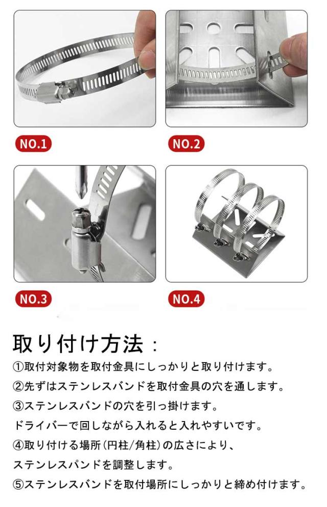 | サイズについての説明 | 取付金具:10.6*10.8cm ステンレスバンド:直径約10cmx3本/20cmx3本 |