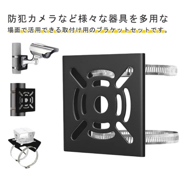 | 防犯カメラなど様々な器具を多用な場面で活用できる取付け用のブラケットセットです。 付属のステンレスバンドで円柱・角柱などの支柱に防犯カメラなど取り付けたい器具をしっかり固定する設計となっております。 表面塗装技術により、防水・防錆設計で、耐久性に優れ、屋外の過酷な環境でも長期間使用可能です。 外壁に穴を開ける必要がなく、付属のステンレスバンドを使って簡単にしっかりと固定できます。 予備として確保することもでき、事務所・店舗・倉庫・飲食店・駐車場・マンションなどの法人様のご利用にもおススメです。 防犯カメラだけでなく、看板やミラー、照明、センサーなどの設置にもご利用いただけます。 取り付け方法: 1.取付対象物を取付金具にしっかりと取り付けます。 2.先ずはステンレスバンドを取付金具の穴を通します。 3.ステンレスバンドの穴を引っ掛けます。ドライバーで回しながら入れると入れやすいです。 4.取り付ける場所(円柱/角柱)の広さにより、ステンレスパンドを調整します。 5.ステンレスバンドを取付場所にしっかりと締め付けます。 | |