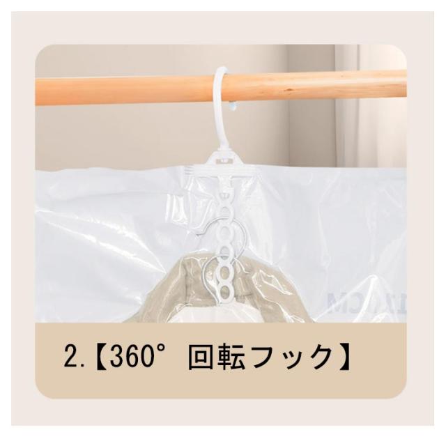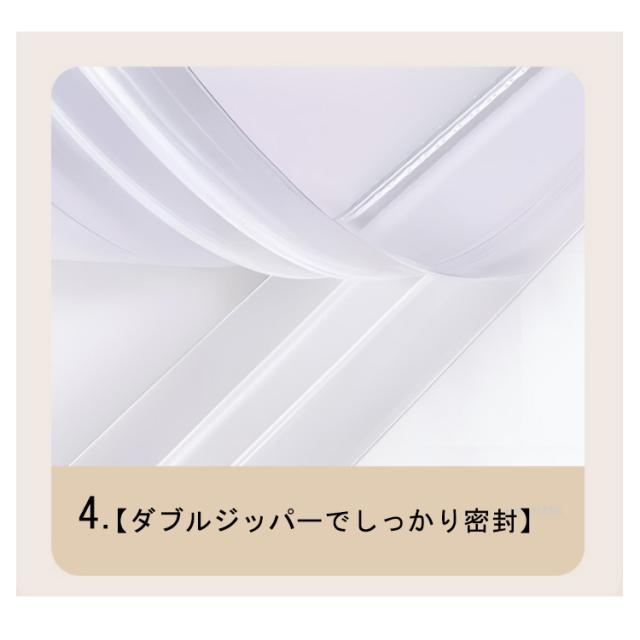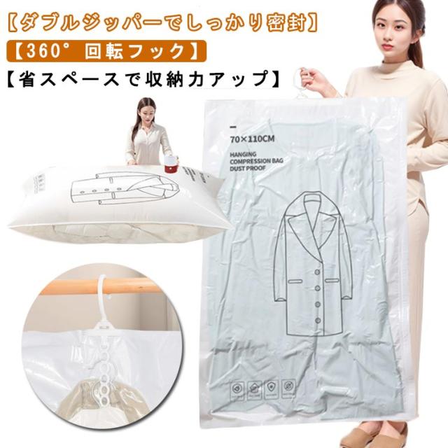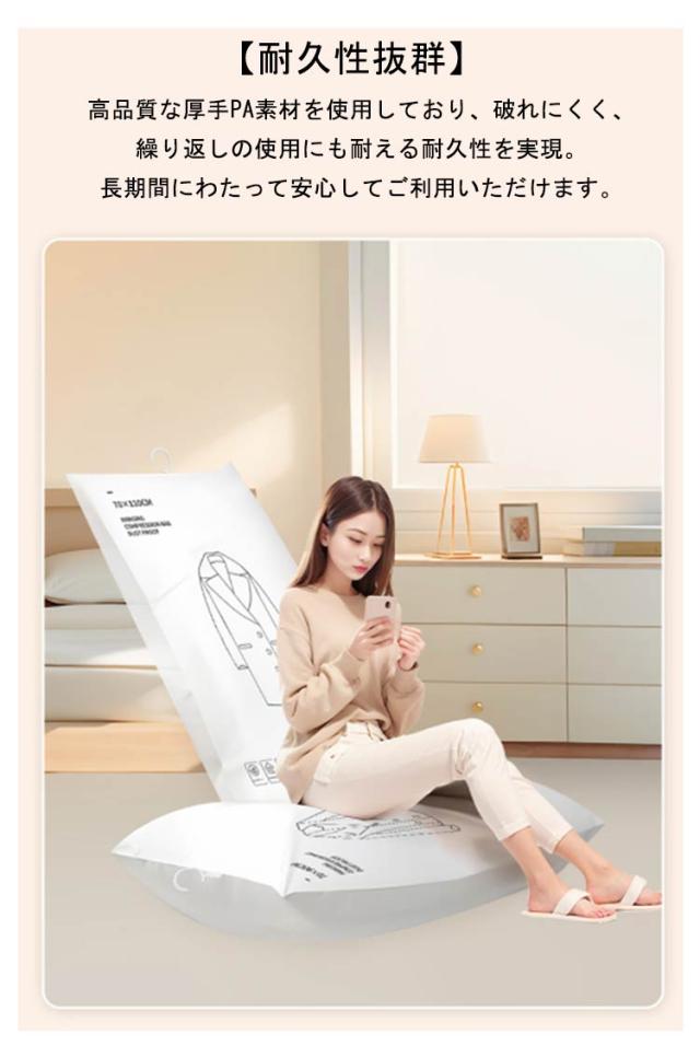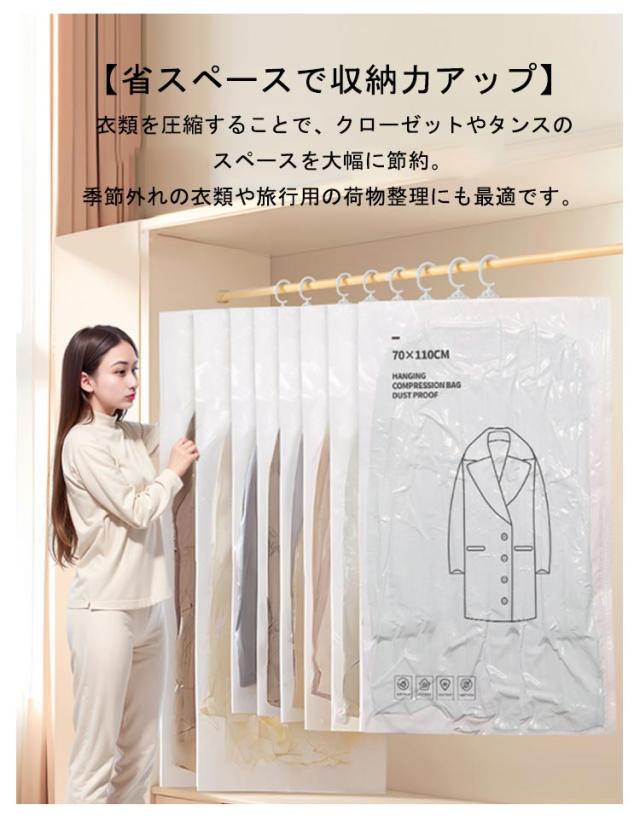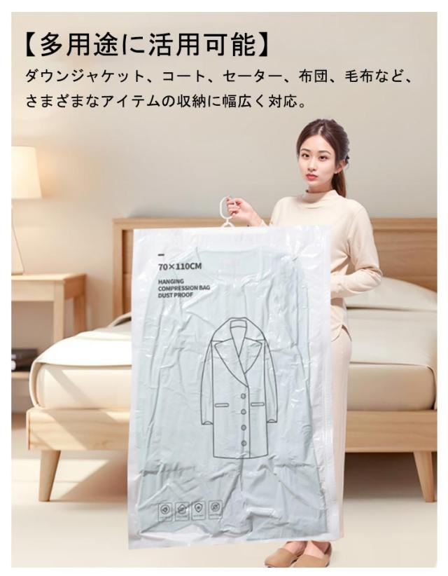 | 【耐久性抜群】 高品質な厚手PA素材を使用しており、破れにくく、繰り返しの使用にも耐える耐久性を実現。長期間にわたって安心してご利用いただけます。 【ダブルジッパーでしっかり密封】 二重の密封ジッパーを採用し、空気漏れを防止。衣類をしっかりと圧縮し、真空状態を長時間保つことで、収納スペースを最大限に節約します。 【360°回転フック】360°回転するフック付きで、衣類を吊るしたまま収納可能。五つの吊り下げループがありますので、5枚以上の服が掛けます。 【使いやすさ】透明で、中に入れた収納物も良く見えますので、探す手間を省くこともできます。 【多用途に活用可能】 ダウンジャケット、コート、セーター、布団、毛布など、さまざまなアイテムの収納に幅広く対応。 【省スペースで収納力アップ】 衣類を圧縮することで、クローゼットやタンスのスペースを大幅に節約。季節外れの衣類や旅行用の荷物整理にも最適です。 | |