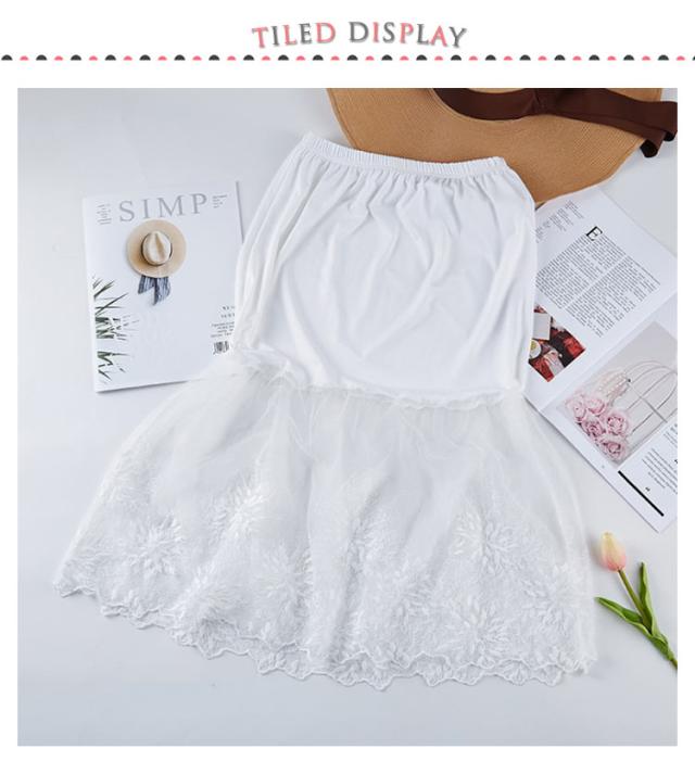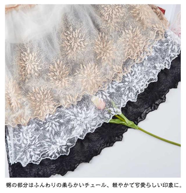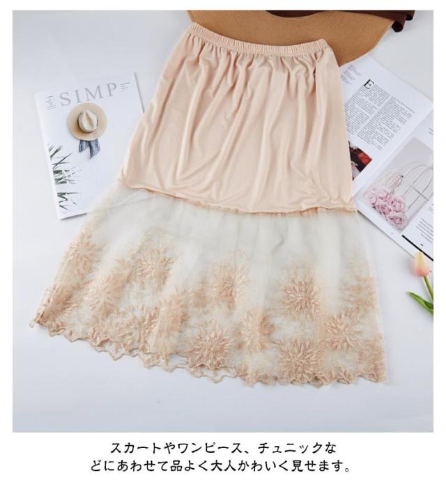 ペチコート スカート 刺繍 インナー ペチコート 裾ふんわり ミモレ丈 レディース スカート チュール ペチコート ロングスカート ウエストゴム 膝下丈 ドレスインナー チラ見せ 下着 フェミニン オシャレ 大人可愛い