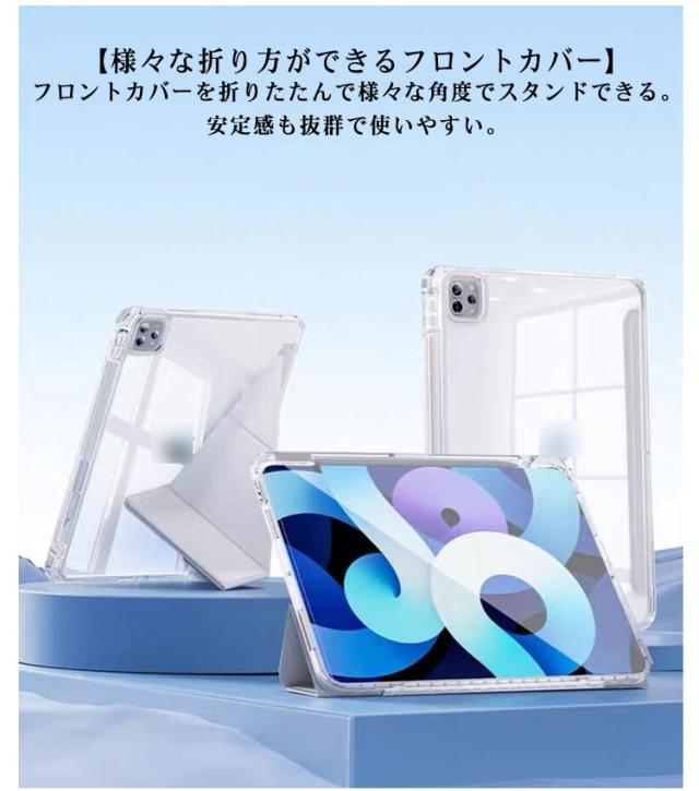 | 縦置き&横置き2way可能なペン収納付きのipadケース。【13インチ】 【様々な折り方ができるフロントカバー】フロントカバーを折りたたんで様々な角度でスタンドできる。安定感も抜群で使いやすい。 【透明なバックケース】背面はクリアな素材のバックケース。Appleマークが透けて見えて、とってもオシャレ! 【ペンシル収納】ケースに便利なペンシル収納付き無くしがちなアップルペンシルもこれで安心 【スリムデザイン】軽量かつ耐久性のあるスマートケース。ソフト素材のケースは、iPadを衝撃などから保護します。 【オートスリープ機能】オートスリープ機能で、バッテリーが無駄に消費してしまうのを防ぎます。 | |