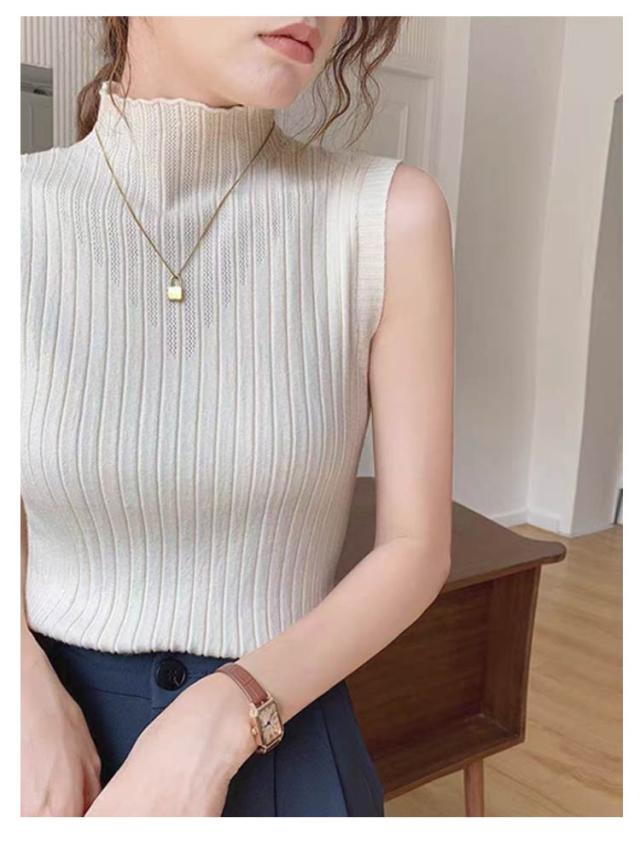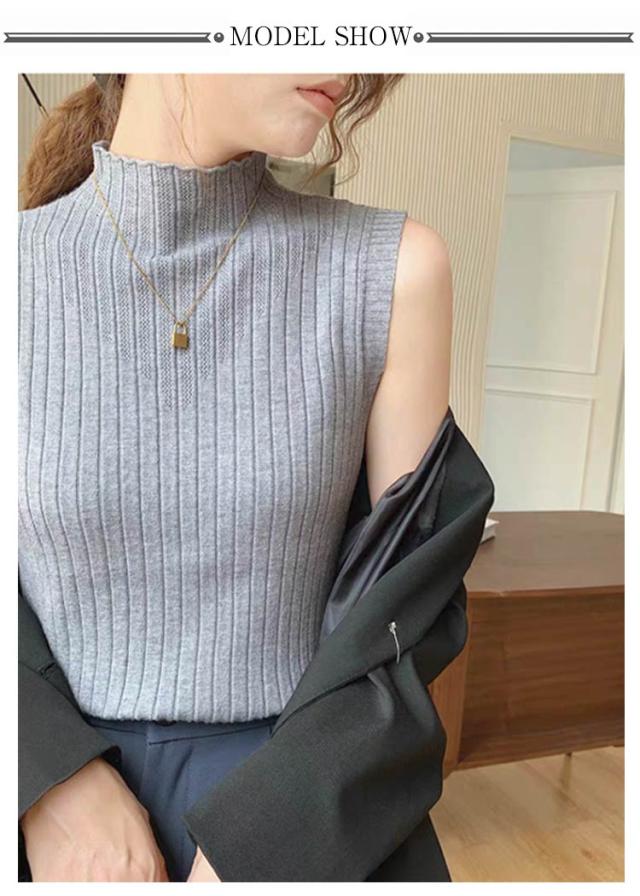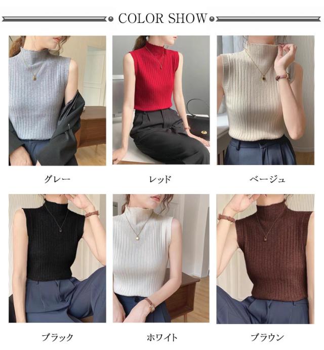 タンクトップ レディース トップス ノースリーブ シンプル Tシャツ レイヤード ハイネック プリーツ ハイネックニット ニットトップス ストレッチ 春 夏 秋 全6色 サマーニット